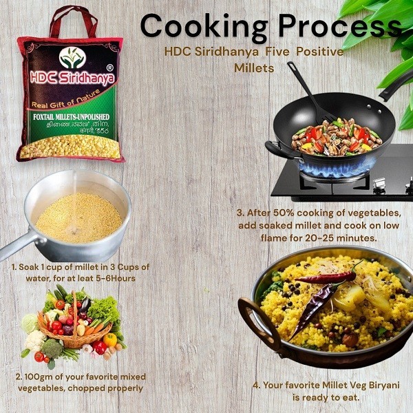- Instruction: (a) Soaking is necessary of Siridhanya millets makes it easier to digest and allows your body to absorb more nutrients. Simply soak your millet in 3 times the amount of water for at least 5-6 hours. (b) Cook the proper way 20-30 minutes in medium flame.